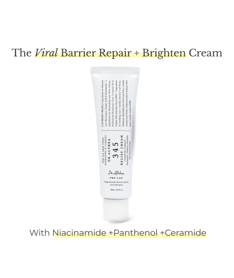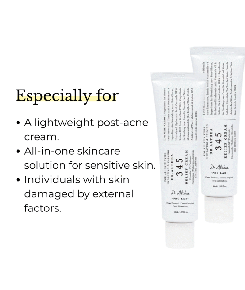 Discover the ultimate post-acne care solution with this clinically tested non-comedogenic gel-cream that’s safe and gentle for acne-prone skin. Dr. Althea’s 345 Relief Cream is a nutrient-rich, regenerating ointment formulated to target blemishes, replenish moisture, and deliver comprehensive soothing care. The innovative formula combines three types of blemish-care ingredients to address post-acne marks and skin recovery, four nourishing components including Niacinamide and Ceramide NP to brighten dullness and deliver lasting hydration deep within the skin, and five soothing ingredients such as Tea Tree Leaf Water, Madecassoside, Beta-Glucan, Panthenol, and botanical extracts to calm sensitive skin and red blemishes caused by external factors. This lightweight cream features a moisturizing texture with a silky finish that absorbs quickly without any greasy feeling, making it perfect for daily use anytime as part of your skincare routine. Enhanced with resveratrol for anti-aging benefits, hyaluronic acid for deep hydration, and a blend of calming extracts including heartleaf (Houttuynia Cordata), centella asiatica, evening primrose, lavender, and hibiscus, this vegan formula is free from artificial coloring, fragrance, and parabens. Clinical testing proves its efficacy in soothing skin, reducing redness, and supporting a healthy, balanced complexion—users report visible improvements in skin smoothness, radiance, and reduced inflammation within just one week of consistent use.